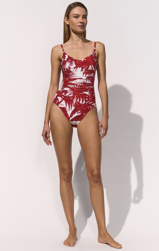Het Palmaria badpak is uitgevoerd in de kleuren offwhite en rood. De geplooide voorkant zorgt voor een speels effect. Het badpak heeft een laag uitgesneden rug.
