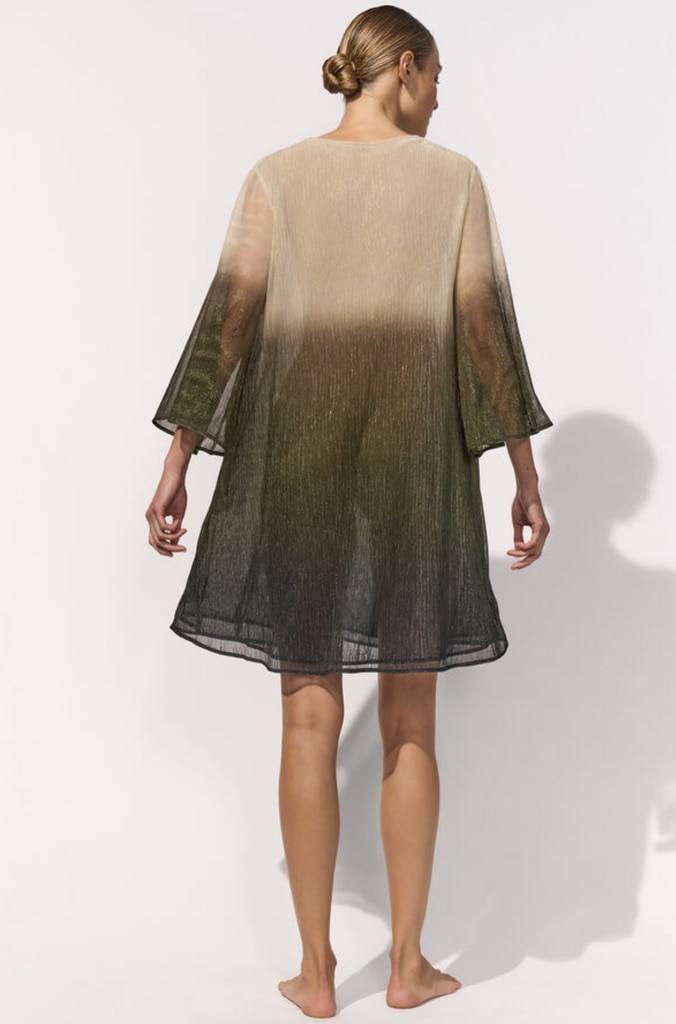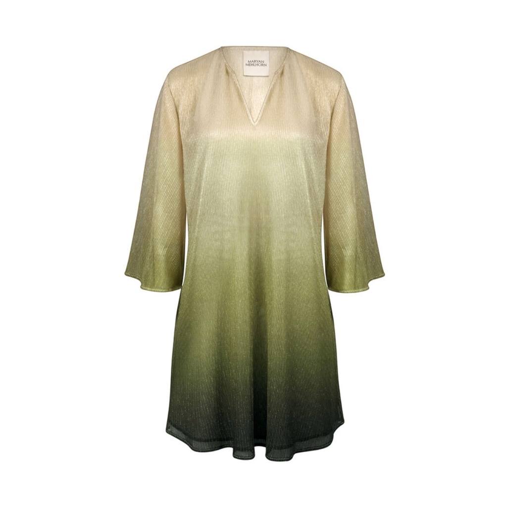 Love deze geweldige metallic gouden tuniek van Maryan Mehlhorn! Het materiaal is licht doorschijnende, luchtige en superlichte stof. De tuniek heeft een V-hals en wijde halflange mouwen. Deze mini-strandjurk past perfect over elk badpak en bikini!