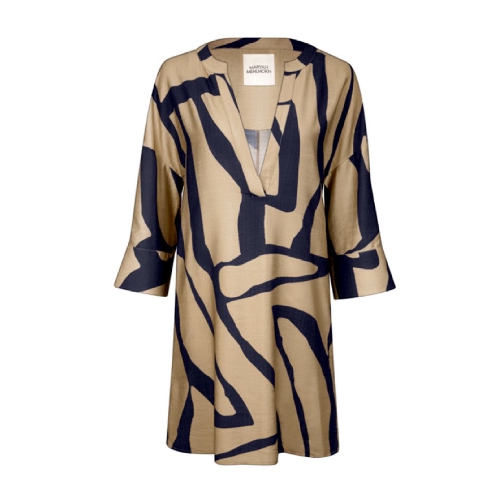 De Silhouet tuniek van Maryan Mehlhorn is een heerlijk luchtig strandjurkje, De jurk heeft een abstracte print in het zwart met bruin. Het heeft een V-hals met kraag en driekwart mouwen. Ideaal over je swimwear of als zomerse outfit!
