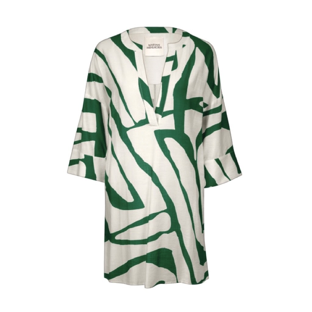 De Silhouet tuniek van Maryan Mehlhorn is een heerlijk luchtig strandjurkje, De jurk heeft een abstracte print in het groen en wit. Het heeft een V-hals met kraag en driekwart mouwen. Ideaal over je swimwear of als zomerse outfit!