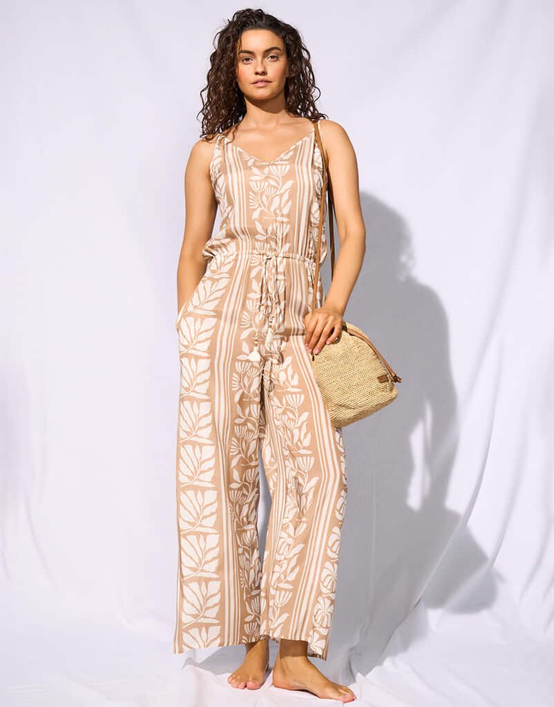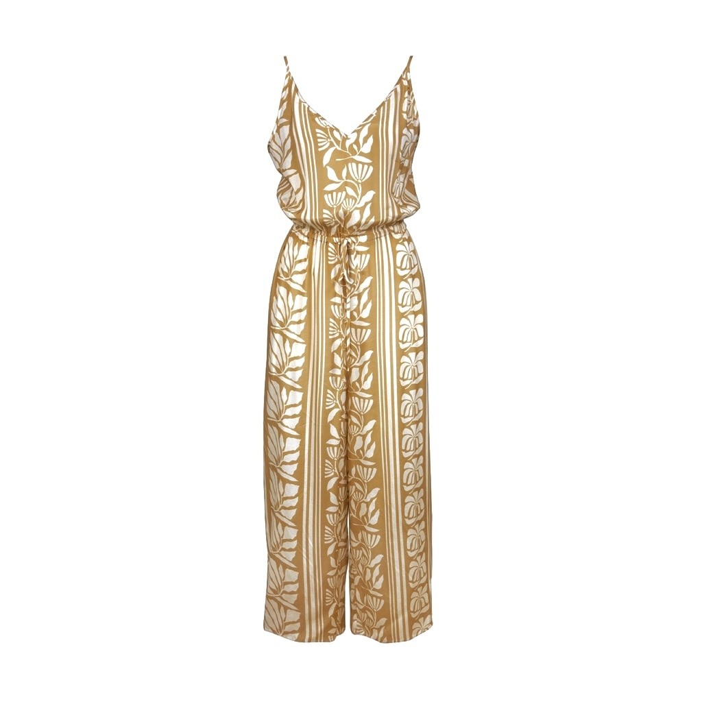 Jumpsuit Coastal Bohemia van Watercult is uitgevoerd in een mooie zandkleur met wit. De jumpsuit is gemaakt van 100% viscose.