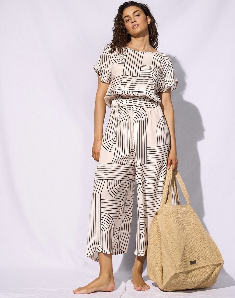 Jumpsuit Line Set van Watercult is uitgevoerd in het Tofu-Black. De jumpsuit is gemaakt van 100% viscose.