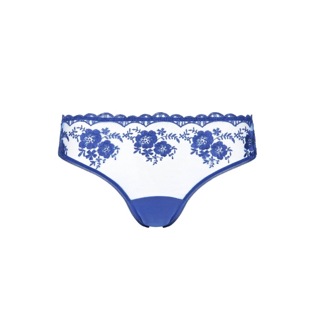 Slip uit de Parisienne collectie van Huit, uitgevoerd in transparante tule met verfijnde borduursels. Voorzien van een licht elastische tailleband en een katoenen kruisje voor extra comfort. De platte afwerking zorgt voor een glad resultaat onder kleding.